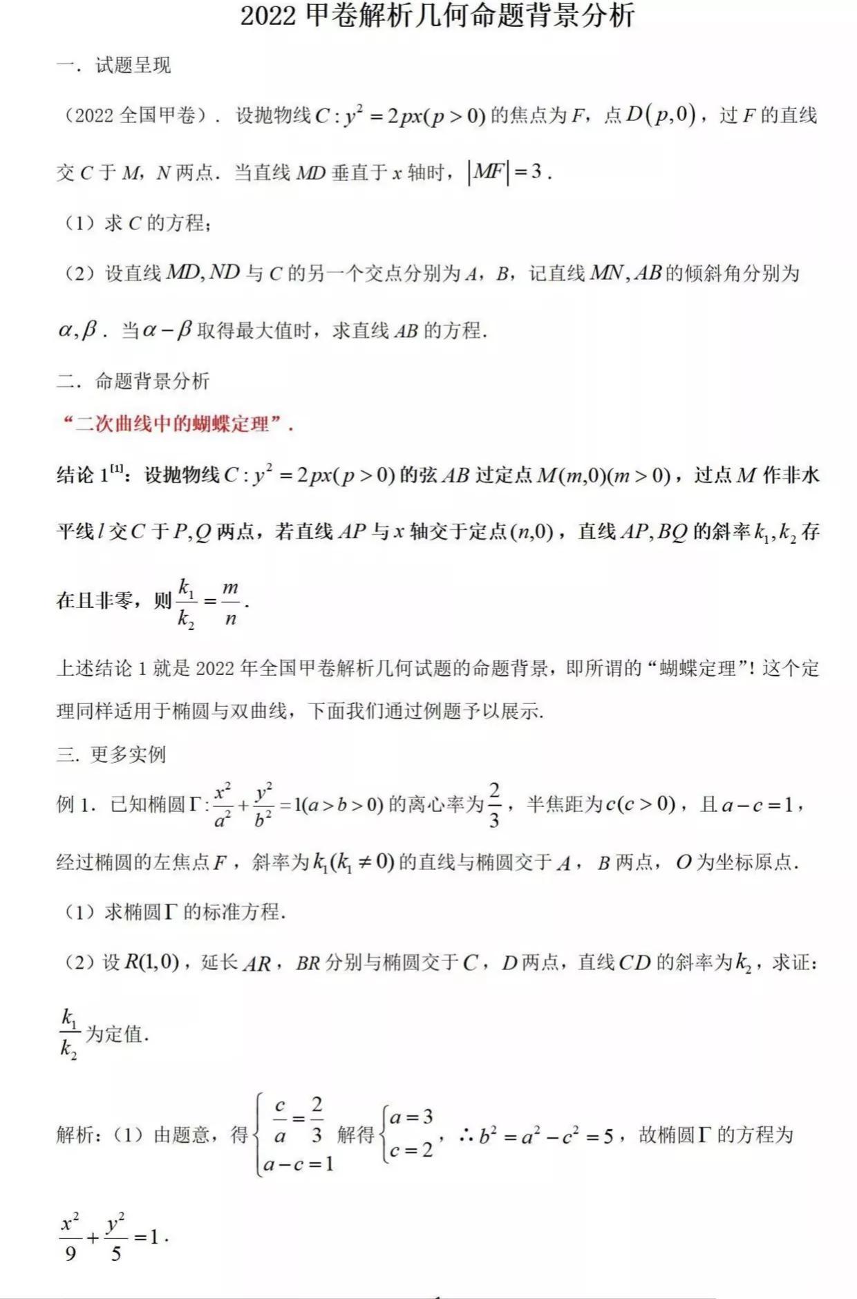 2022甲卷解析几何以“蝴蝶定理”为背景展开,考察了斜率之商为定值的情形,本文针对此题,着力探寻其命题背景. 全文分成以下几个主要部分:1.将甲卷这道题目推广到一般的抛物线情形;2.通过例题给出椭圆中“蝴蝶定理”的情形;3.探究一类斜率之商为定值,直线过定点的情形;4. 给出坎迪定理的内容,并介绍了利用该定理解决蝴蝶问题的文献;5.大家可以一起探讨交流。谢谢