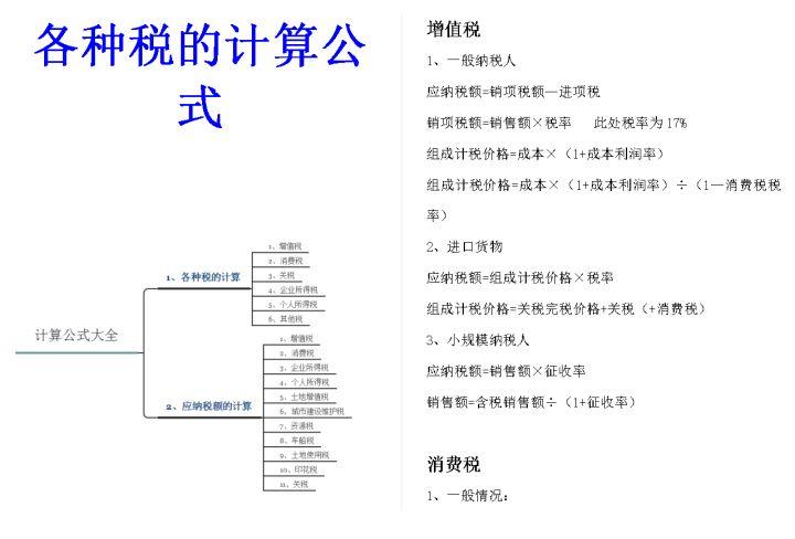 在财务工作中有一项很重要的环节那就是应纳税额的计算,不管是一般纳税人还是小规模纳税人;不管是增值税还是企业所得税,只要涉及到税务的计算,那就少不了会用到这些计税公式。