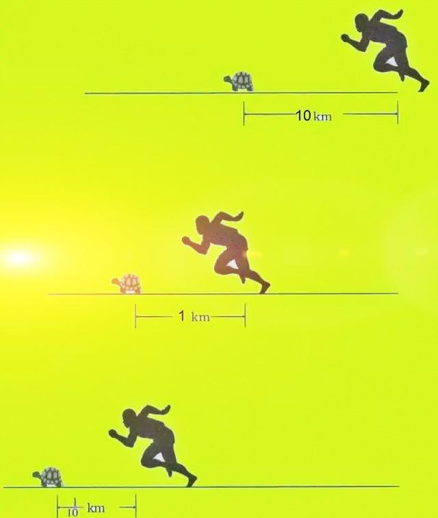 开始时阿基里斯落后乌龟10km,假设阿基里斯的速度是乌龟的10倍,那么一直跑下去阿基里斯肯定能追上乌龟。但是现在我们考虑另外一种事实,当阿基里斯正好跑完这10km时,乌龟又往前跑了1km;当阿基里斯跑完这1km时,乌龟又跑了0.1km;当阿基里斯跑了0.1km时,乌龟又跑了0.01km……,如此下去,阿基里斯永远也赶不上乌龟。