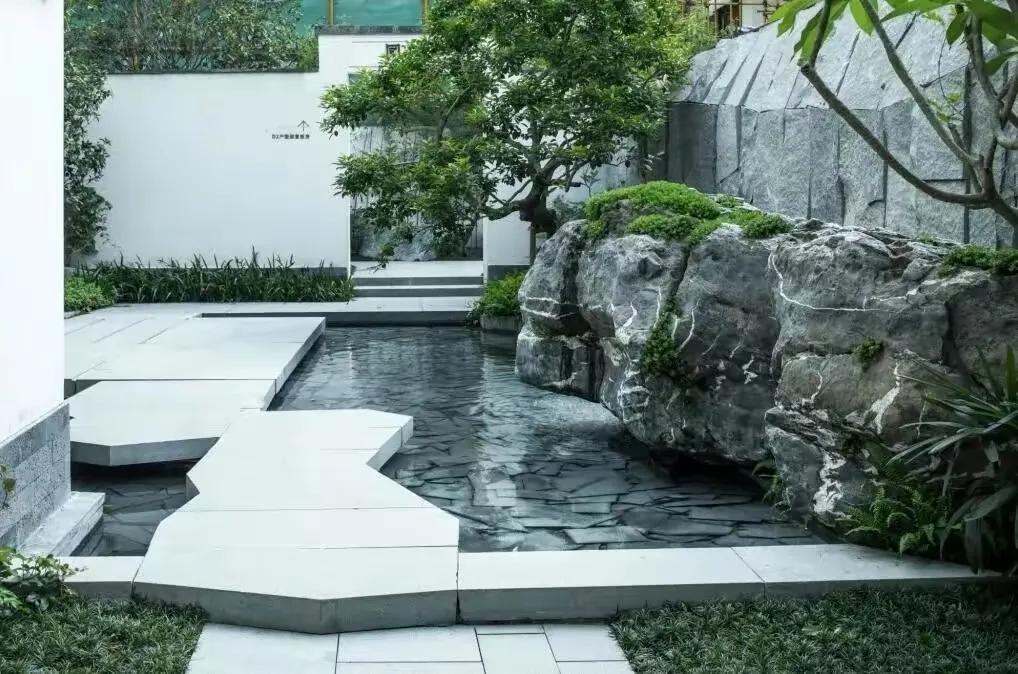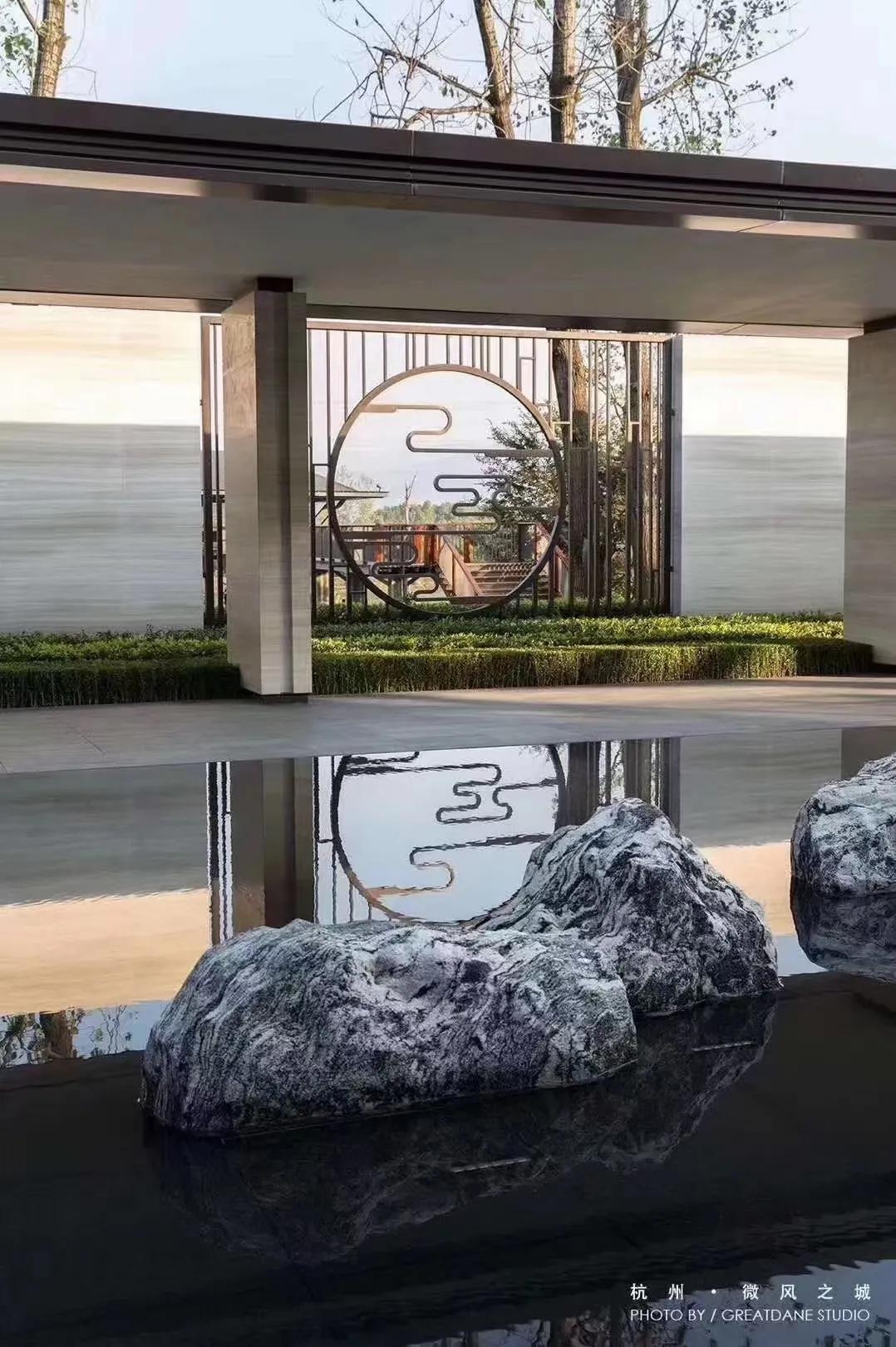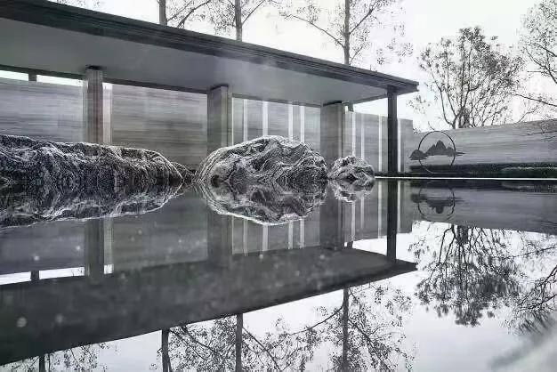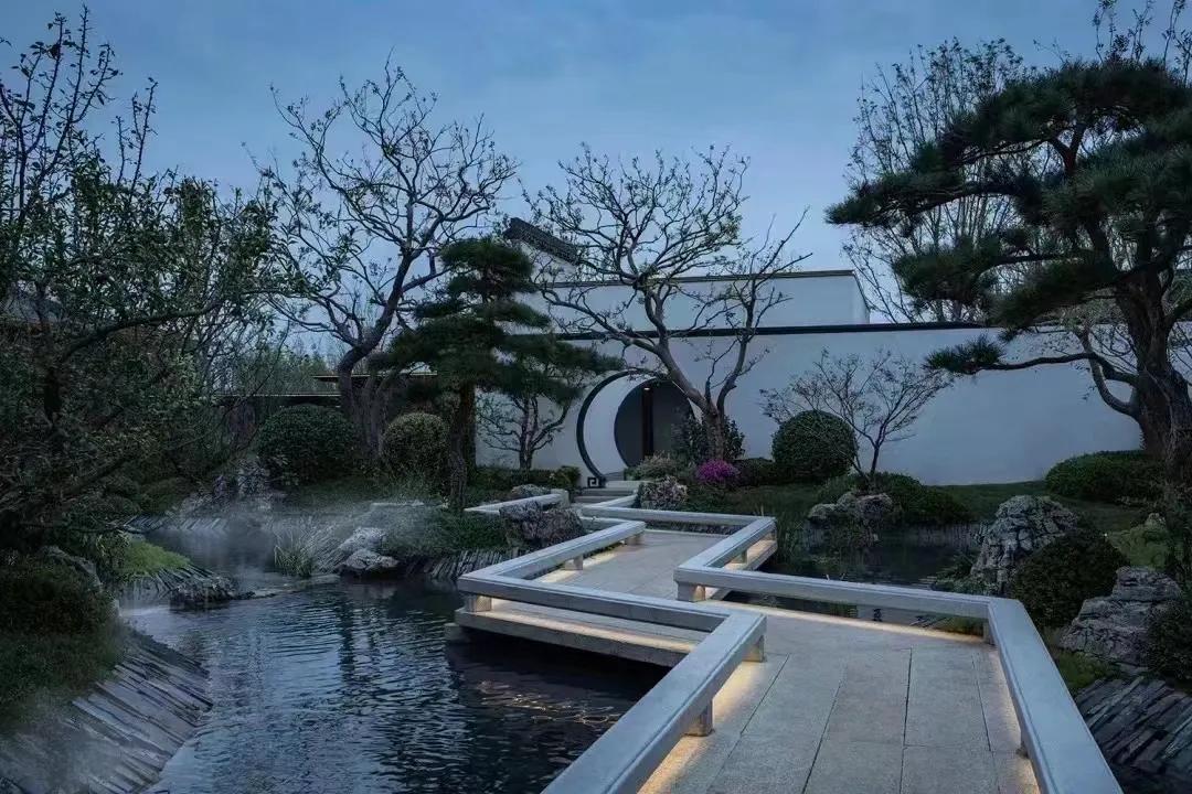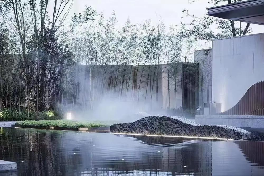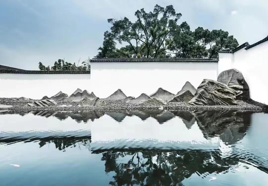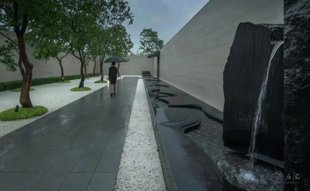 水墨画韵,传统中式或简中式,浅水如镜、同韵线条、讲究节奏、综合使用现代材质、科技。造景变化大气而不繁缛。