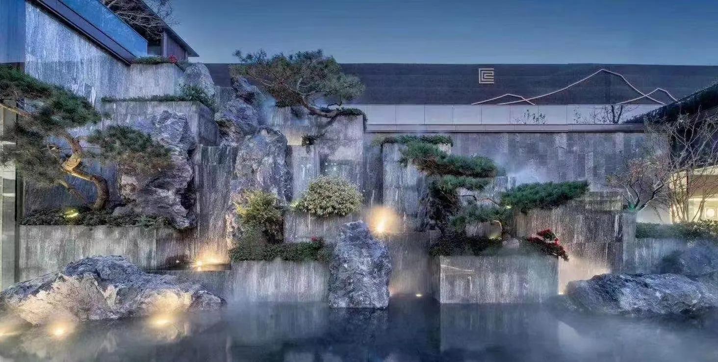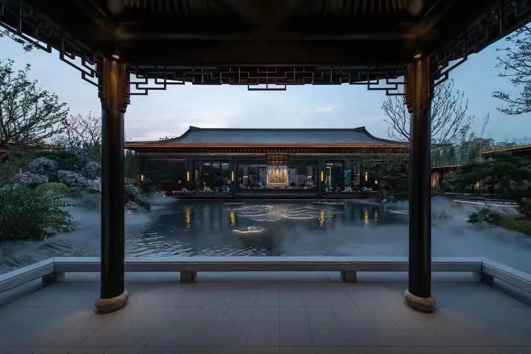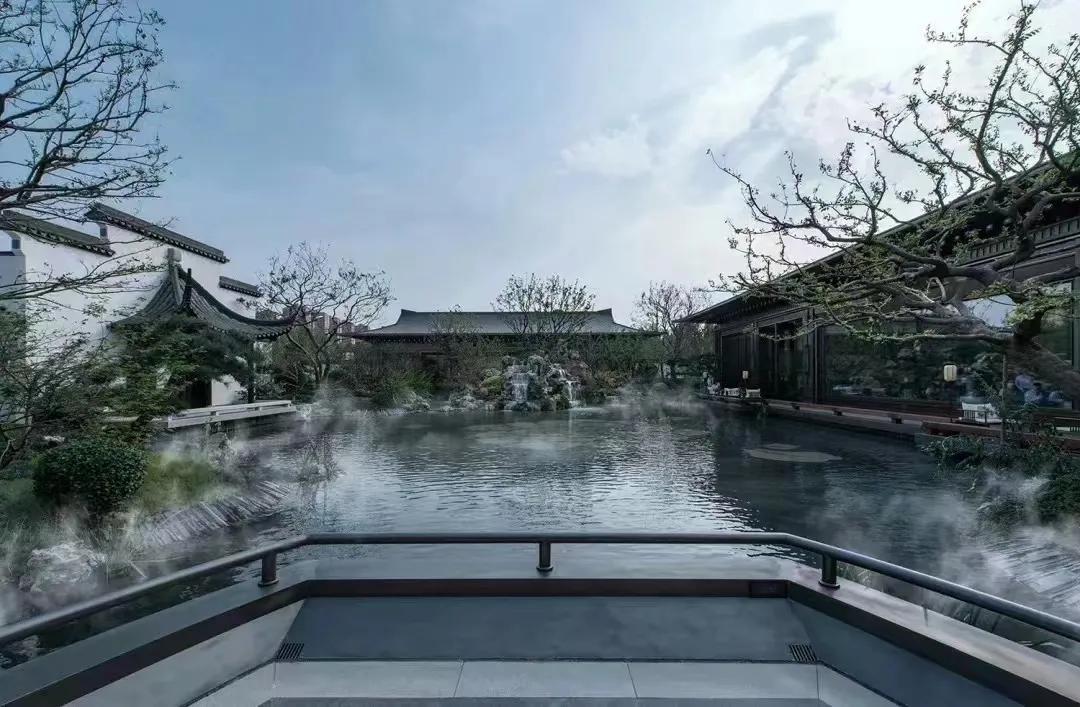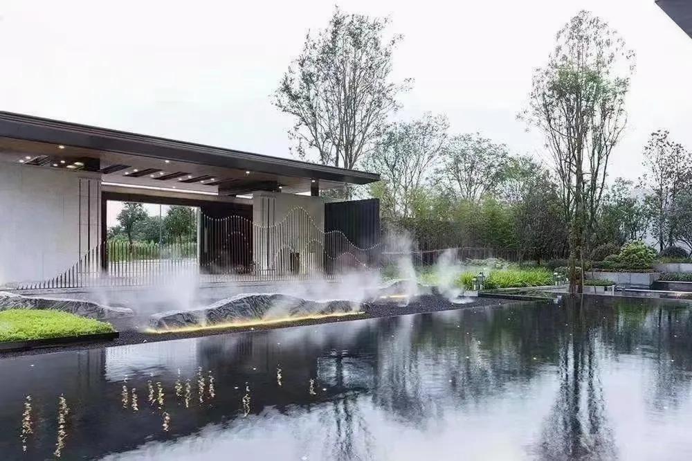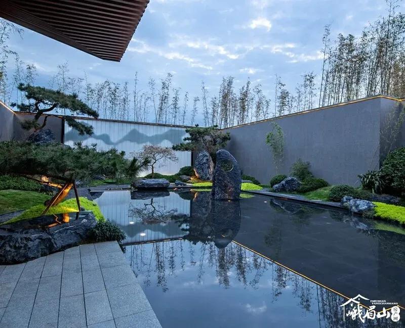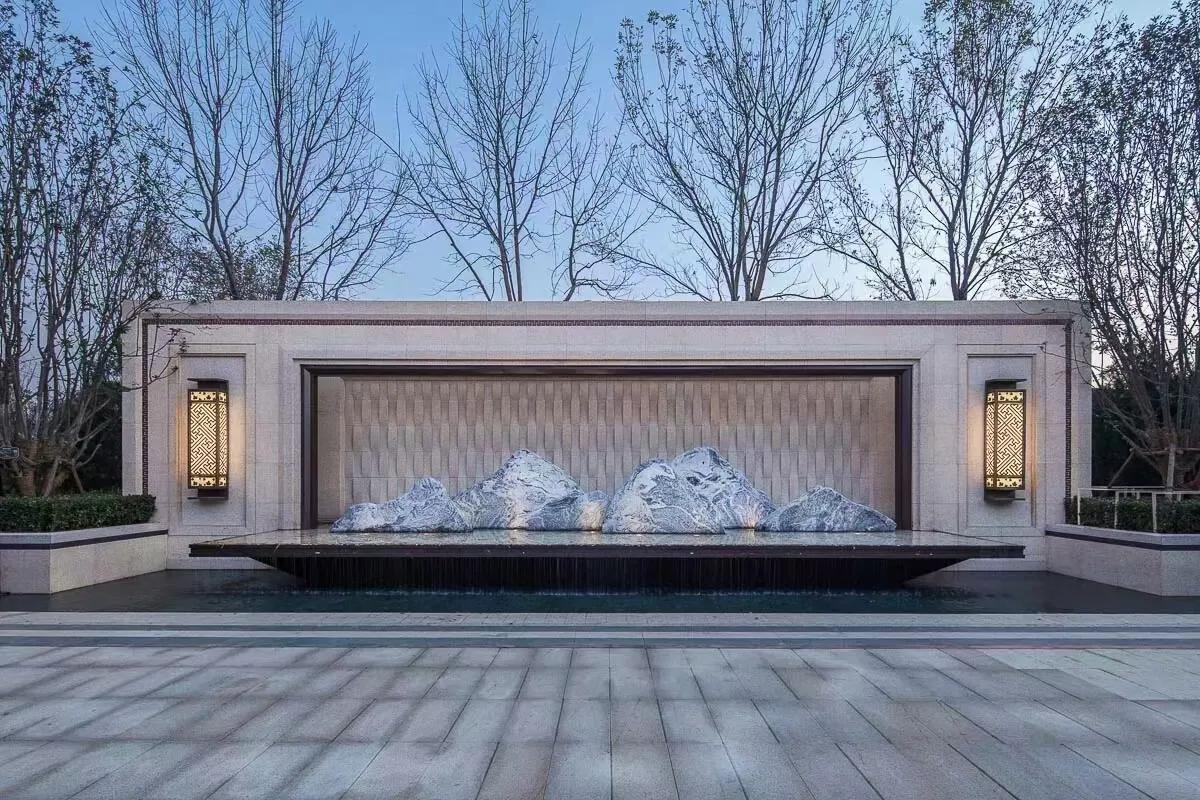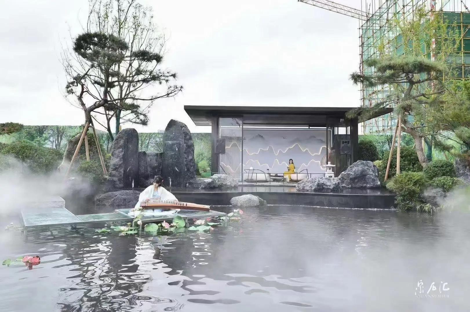 水墨画韵,传统中式或简中式,浅水如镜、同韵线条、讲究节奏、综合使用现代材质、科技。造景变化大气而不繁缛。