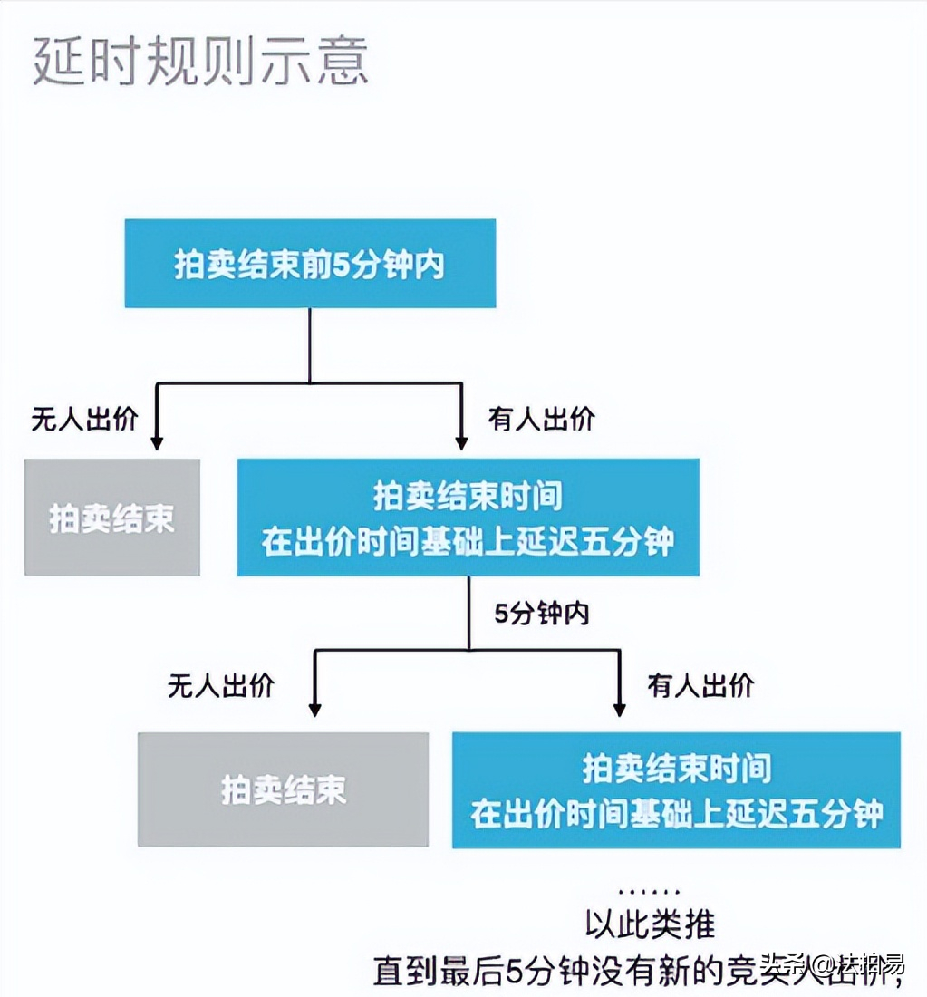 假设拍卖结束的时间为10点整,那么在9点50分-10点期间内,无人出价则10点整拍卖结束。若有人在9点58分15秒出价,则拍卖时间延时至10点03分15秒,此时无人出价拍卖结束。若又有人在10点02分00秒出价,则拍卖时间再次延长5分钟,即至10点07分00秒。以此类推,直到最后5分钟没有新的竞买人出价,该拍品的延时竞拍结束。