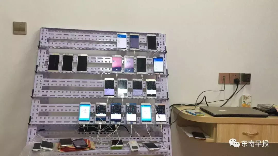 民警进门抓捕时,该犯罪团伙在展架上的智能手机还在运作,屏幕上不断闪烁,更换着新的二维码和已成功支付收款的标识。为了保证手机不会因耗完电量关机,该团伙为展架上的每一台手机都连上了充电线。