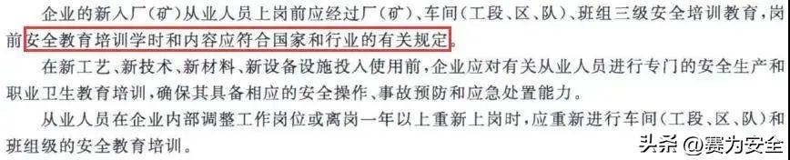 7.0.3 根据建设部相关文件规定,建筑施工企业从业人员每年应接受一次专门的安全培训,其中企业法定代表人、生产经营负责人、项目经理不少于30学时,专职安全管理人员不少于40学时,其他管理人员和技术人员不少于20学时,特殊工种作业人员不少于20学时;其他从业人员不少于15学时,待岗复工、转岗、换岗人员重新上岗前不少于20学时,新进场工人三级安全教育培训(公司、项目、班组)分别不少于15学时、15学时、20学时。