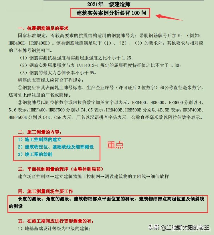 另外它还加入了助记方法,有些记住关键字就能串起来一大片,不会考的类型和知识点也给你标注清晰了,超赞!一建实务的考点都在这100问里了,把这个背会就能过,效果要比你单纯死啃教材强很多!