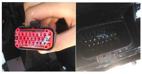 步骤三:将尿素泵的插头拔下来查看,发现针脚插头都有腐蚀,于是清理了插头并在针孔内填塞了一些铜丝,然后重新尝试进入系统后,只显示一个故障码——排放超标。