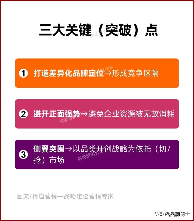 答案是,先打造差异化的品牌定位,然后避开竞争对手强势实施侧翼突围(利于自身顺势出击抢占市场)。