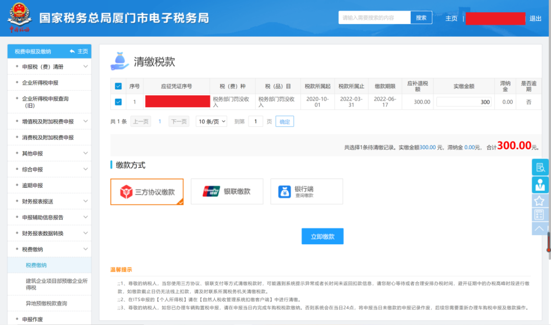 第七步:点击【填写申报表】按钮,管征税务机关完成违法处理,系统弹出提示:当前逾期申报罚款已生成,请先缴纳罚款后再进行申报。点击【确定】跳转到清缴税款页面,缴纳罚款。缴款方式可自行选择。缴纳罚款之后,回到逾期申报清册页面,点击需要逾期申报的税费种,可进行逾期申报。