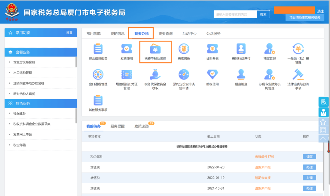 第二步:选择【我要办税】→【税费申报及缴纳】,进入税费申报及缴纳界面。
