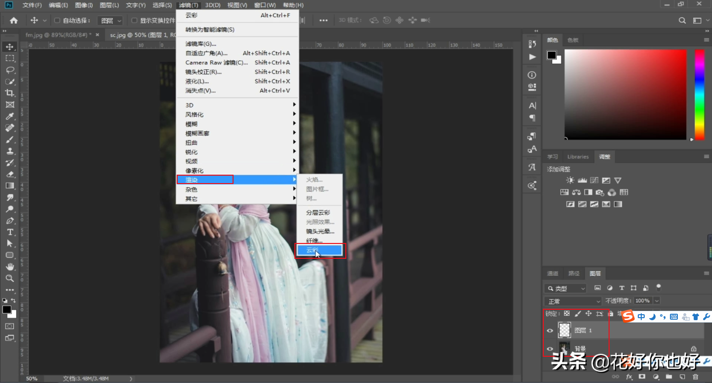 1.打开素材,新建一个空白图层。接着上方菜单栏执行滤镜-渲染-云彩