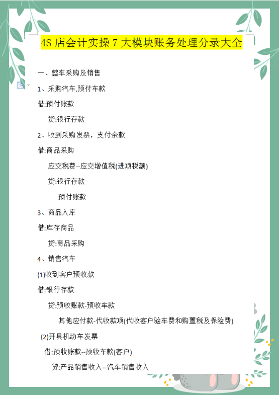今天小编就把这份汽车4S店会计必备的会计分录及财税处理分享给大家哦~一起来看看吧。