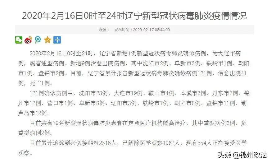 2020年2月16日0时至24时,辽宁省新增1例新型冠状病毒肺炎确诊病例,为大连市病例,属普通型病例。新增9例治愈出院病例,其中沈阳市2例、阜新市3例、铁岭市1例、朝阳市1例、盘锦市2例。目前,辽宁省累计报告新型冠状病毒肺炎确诊病例121例,治愈出院41例,死亡1例。