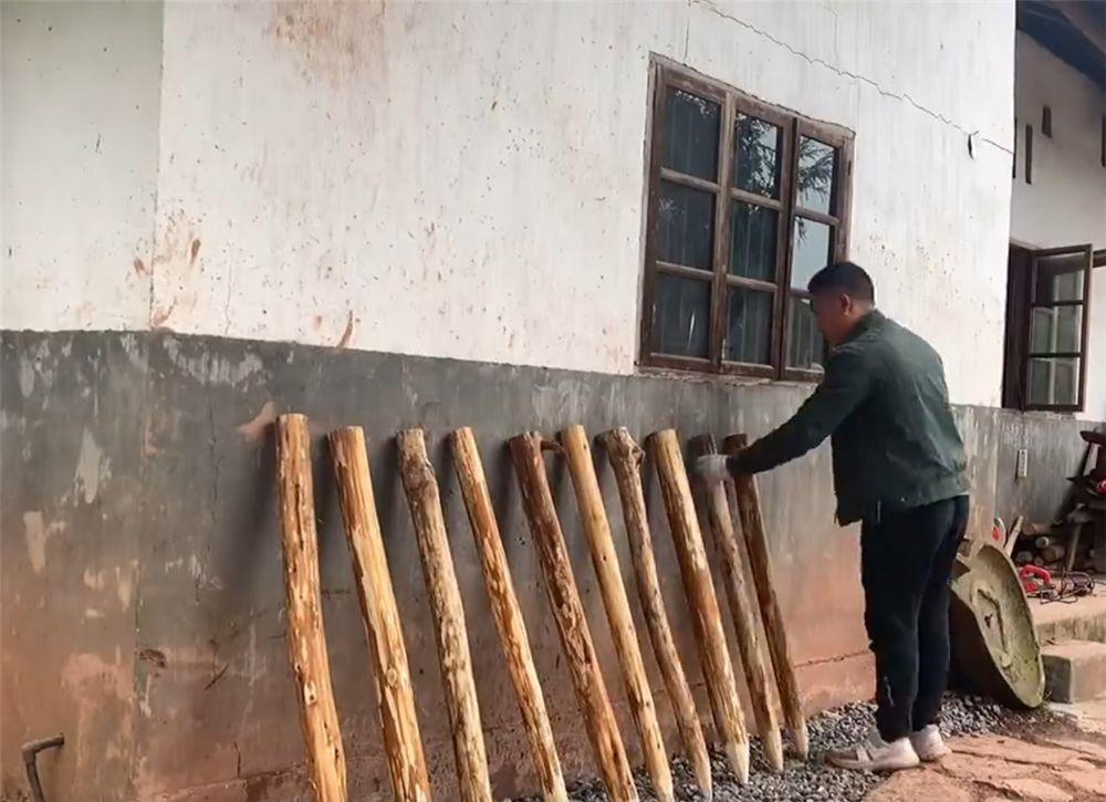 同样地,这位小哥还是自己找来锯和木头,自己动手削尖,当做篱笆墙的桩子。