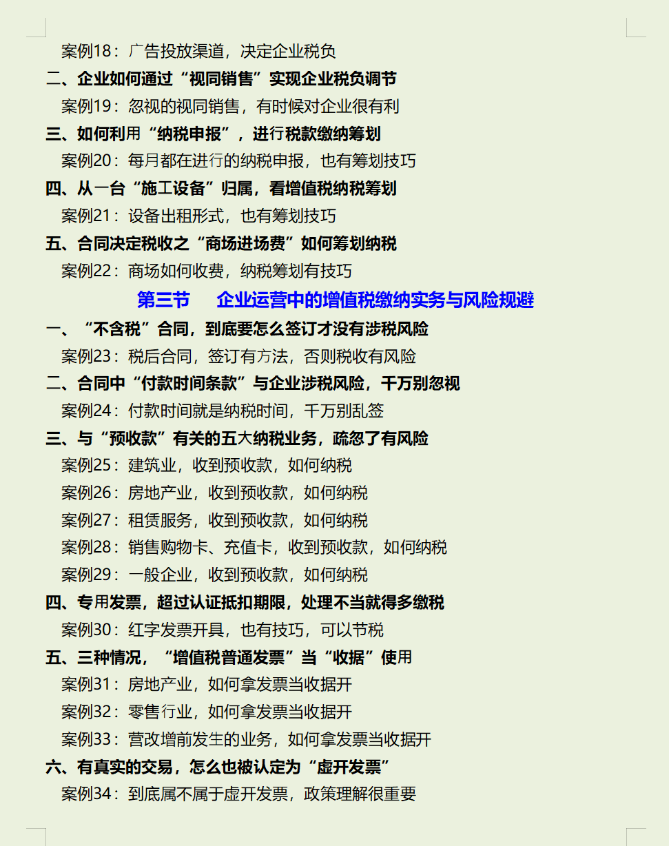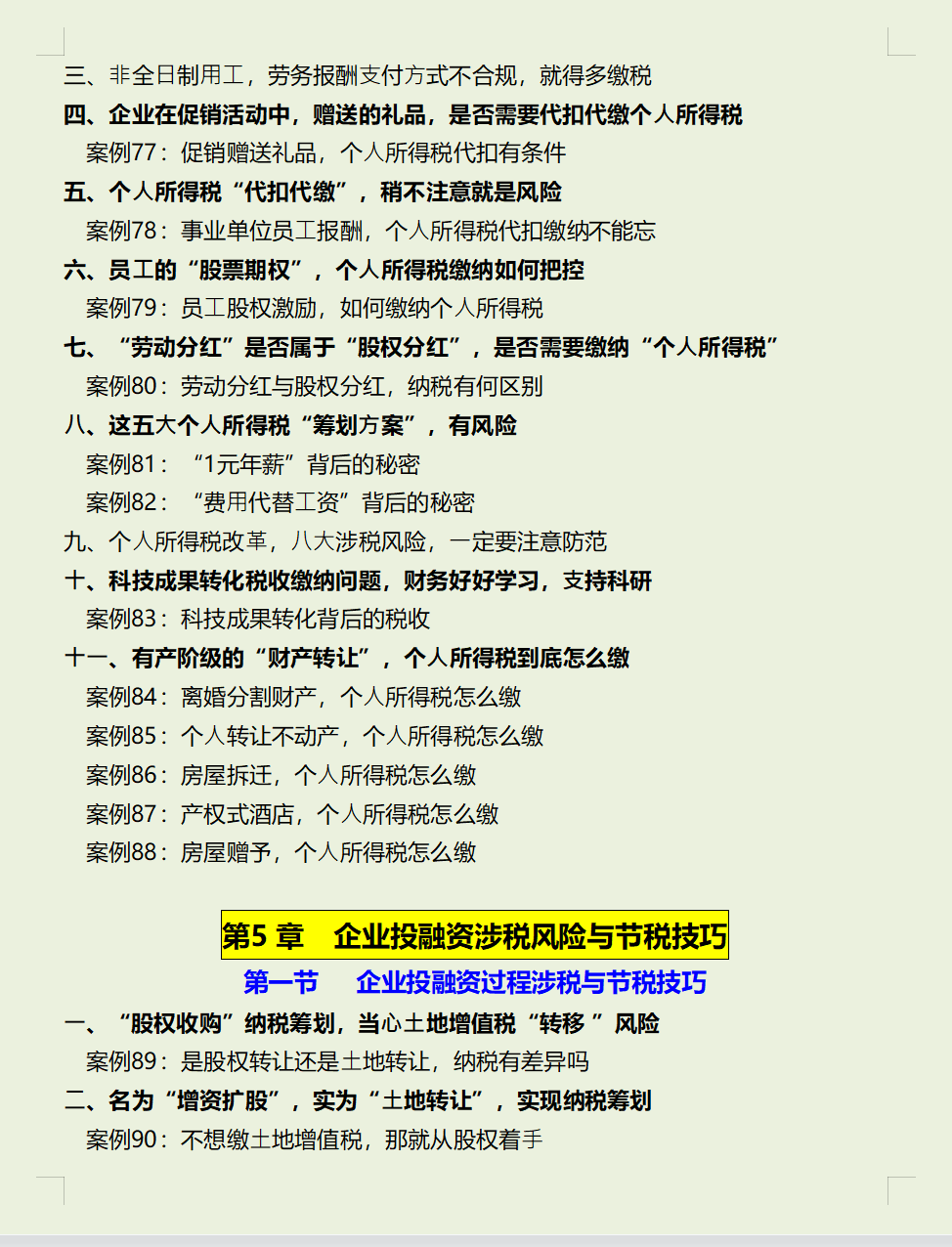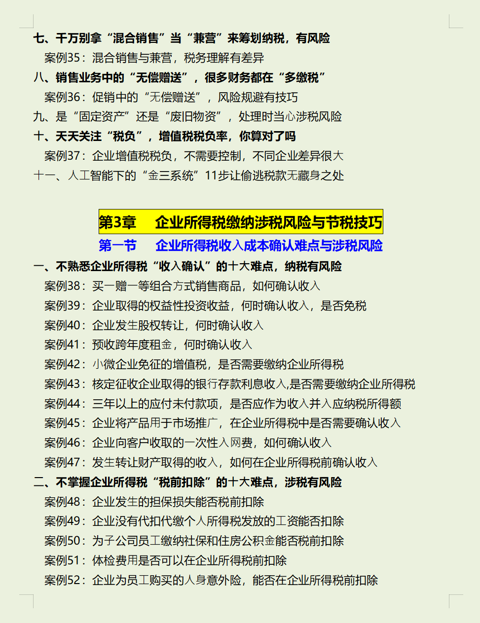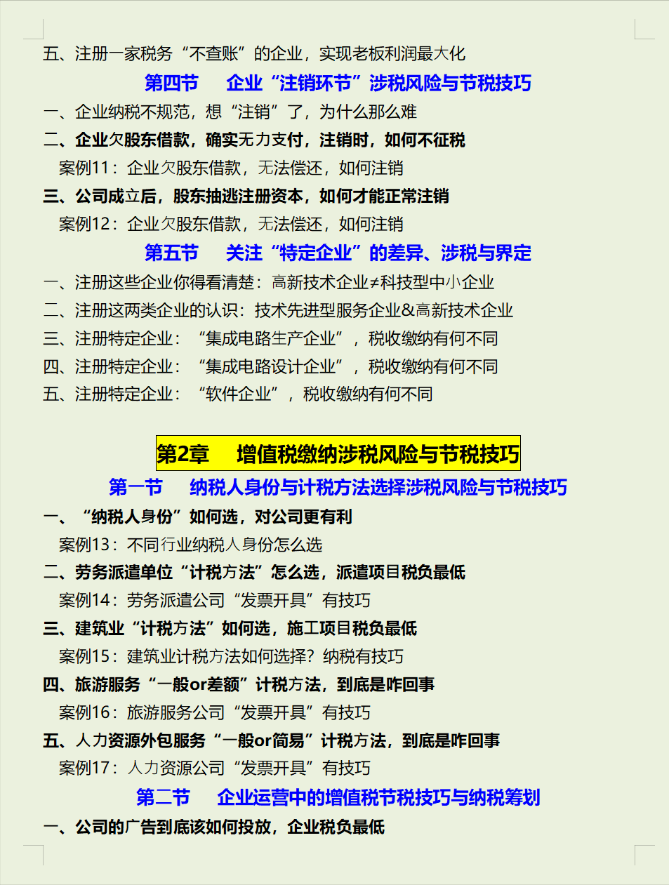为此特意向人家虚心请教了一番,他就给整理了一份企业涉税风险防范与节税技巧案例汇总,从公司的注册到注销所涉及到的所有税筹都在里面了,一起来瞅瞅吧
