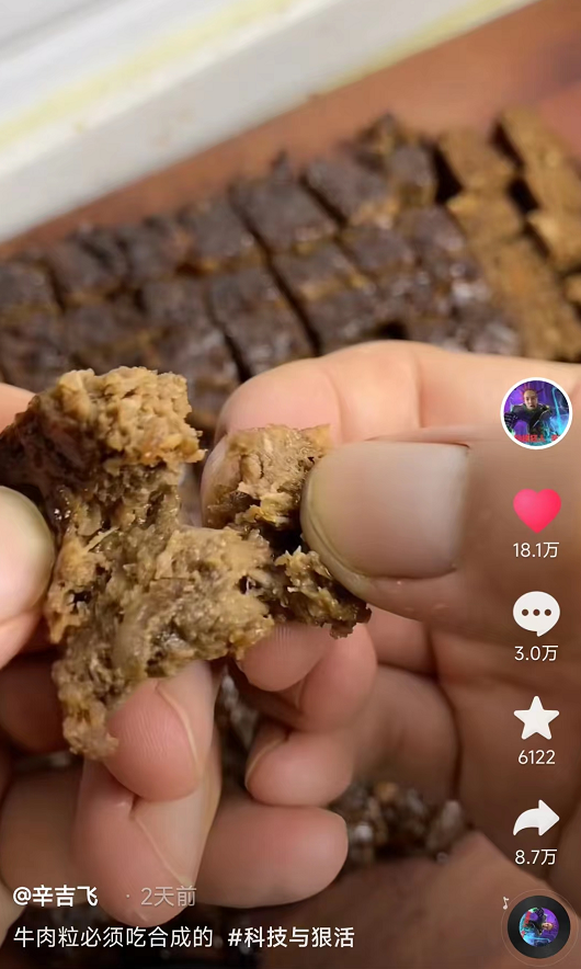 针对某网红售卖的9.9元的牛肉粒,“辛吉飞”演示了牛肉粒的科技做法。图源:抖音