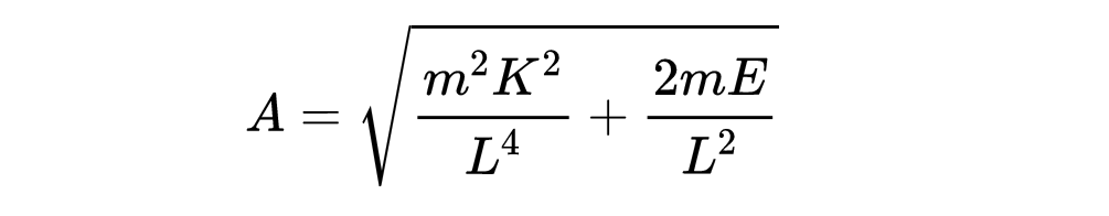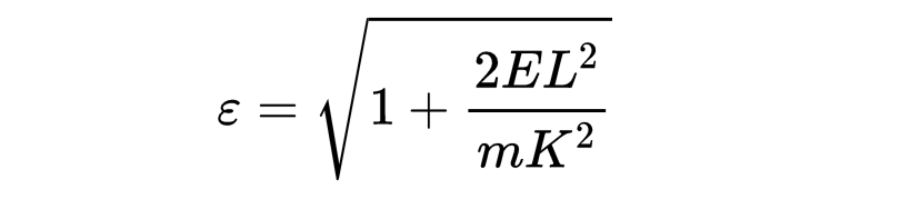 r =0是二次曲线的焦点θ_0是轨道在包含曲线的平面上的方向。A是一个常数。因为θ_0是任意的,所以我们可以选择A为正。我们对椭圆轨迹特别感兴趣。在式14中,它有两个转折点,分别为θ_0=0和θ_0=π。由方程9和方程11可知,当有效势等于总能量E时,转折点就出现了。因此,求解方程11使有效势等于E,我们得到两个方程(每个转折点一个),用E和L表示。将这些方程与θ_0=0和θ_0=π的方程14进行比较,我们得到了A的值: