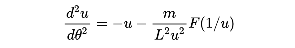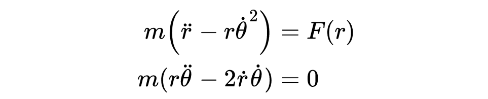 由于L是常数,位置矢量和速度矢量x和v总是在一个固定的平面上(与L正交),这大大降低了问题的复杂性。方程式4,加上牛顿第二运动定律F = ma,给出了我们想要的运动方程: