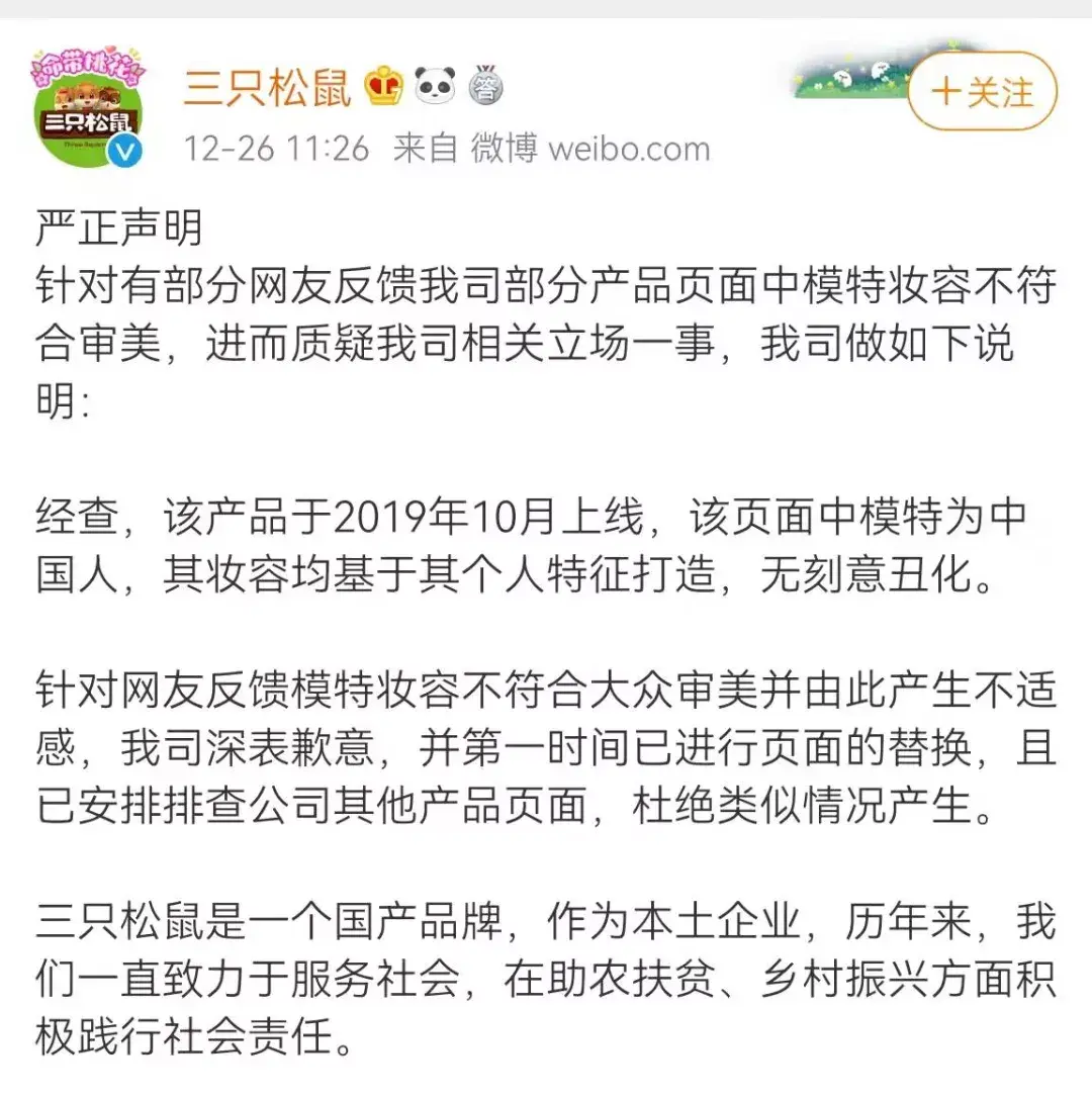 当日上午,三只松鼠通过其官方微博发表声明,称针对网友反馈模特妆容不符合大众审美并由此产生的不适感,公司深表歉意,并在第一时间进行了页面替换,且已安排排查公司其他产品页面,拒绝类似情况再次发生。