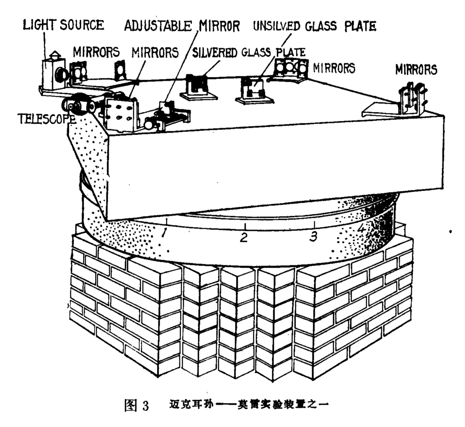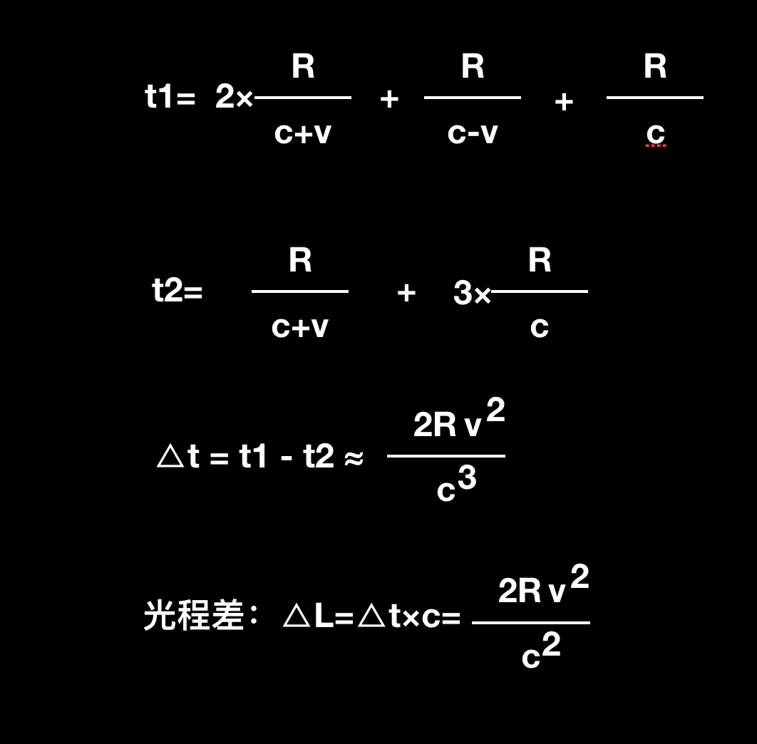 那么水平方向光相对于仪器的的传播速度就是“c+v”(当光束逆着运动方向)和“c-v”(当光束顺着运动方向);竖直方向上,光速还是“c”。