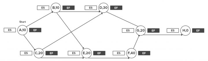 由于项目经理的目标是尽快完成项目(当然不影响质量),因此我们将尝试为每个活动找到最早的完成时间。为此,将所有任务组织成一个流程图,并在任务ID旁边记下它们的持续时间。 箭头指示活动的顺序。 我们将在活动左侧标记最早开始(ES)时间,在右侧标记最早完成(EF)时间。: