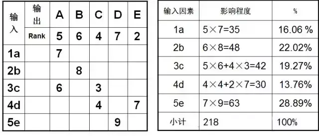 下图是X-Y矩阵图,其中abcde为输入因素,ABCDE为输出因素,A因素影响重要度为5,B为6,C为4,D为7,E为2;请确定a、b、c、d、e输入因素的影响顺序。
