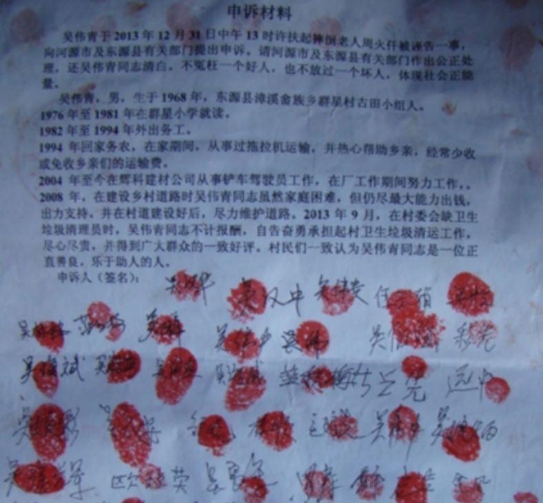 吴伟青自杀后,群星村村委会组织村民们写了一份申诉材料,材料中写明“吴伟青扶起摔倒老人被诬告”,并且声称吴伟青是一个乐于助人的老实人。