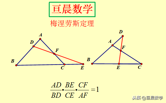 梅涅劳斯定理指的是:一条直线(红线)与一个三角形的三边或延长线相交,三角形的三个顶点按顺时针或逆时针方向,三条边顶点到交点的比值的积为1.其证明方法很多,相似三角形即可证明。