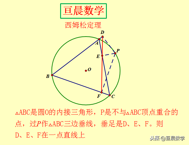 西姆松定理:过三角形外接圆上异于三角形顶点的任意一点作三边所在直线垂线,则三垂足在一点直线上,这条直线我们称作西姆松线。