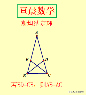 斯坦纳定理:两内角平分线相等的三角形必为等腰三角形。