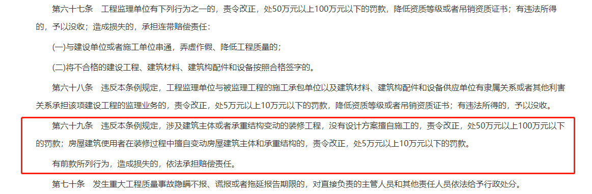 违反本条例规定,涉及建筑主体或者承重结构变动的装修工程,没有设计方案擅自施工的,责令改正,处50万元以上100万元以下的罚款;房屋建筑使用者在装修过程中擅自变动房屋建筑主体和承重结构的,责令改正,处5万元以上10万元以下的罚款。