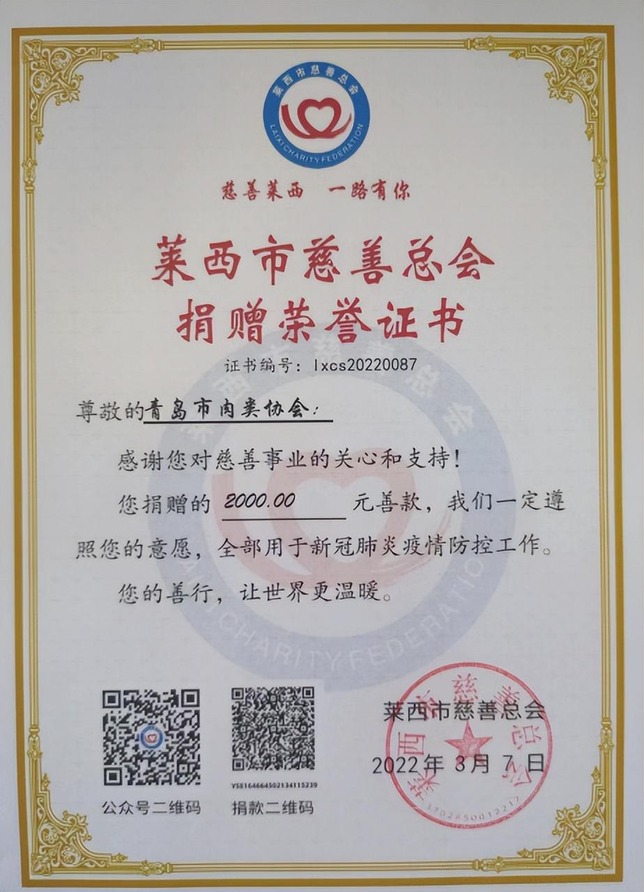 2022年3月初,莱西市突发新冠疫情,协会党支部迅速响应青岛市社会组织综合党委号召和倡议,动员会员单位捐款捐物支持莱西抗击疫情。协会会长单位青岛万福集团股份有限公司和青岛牛道贸易有限公司、青岛九联集团股份有限公司、青岛创裕生鲜配送有限公司等32家会员企业共计捐款245.41万元,为莱西市抗击新冠疫情取得胜利贡献了自己的力量。协会也被青岛市社会组织总会评为“疫情防控期间突出贡献社会组织”。
