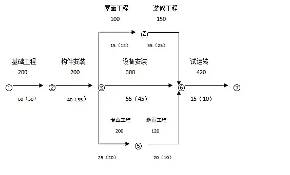 压缩②〜③工作5天、③〜⑥工作8天、③〜④工作3天、 作2天;增加费用100+1500+1200+840=4540元,为最少费用。(2.0分)