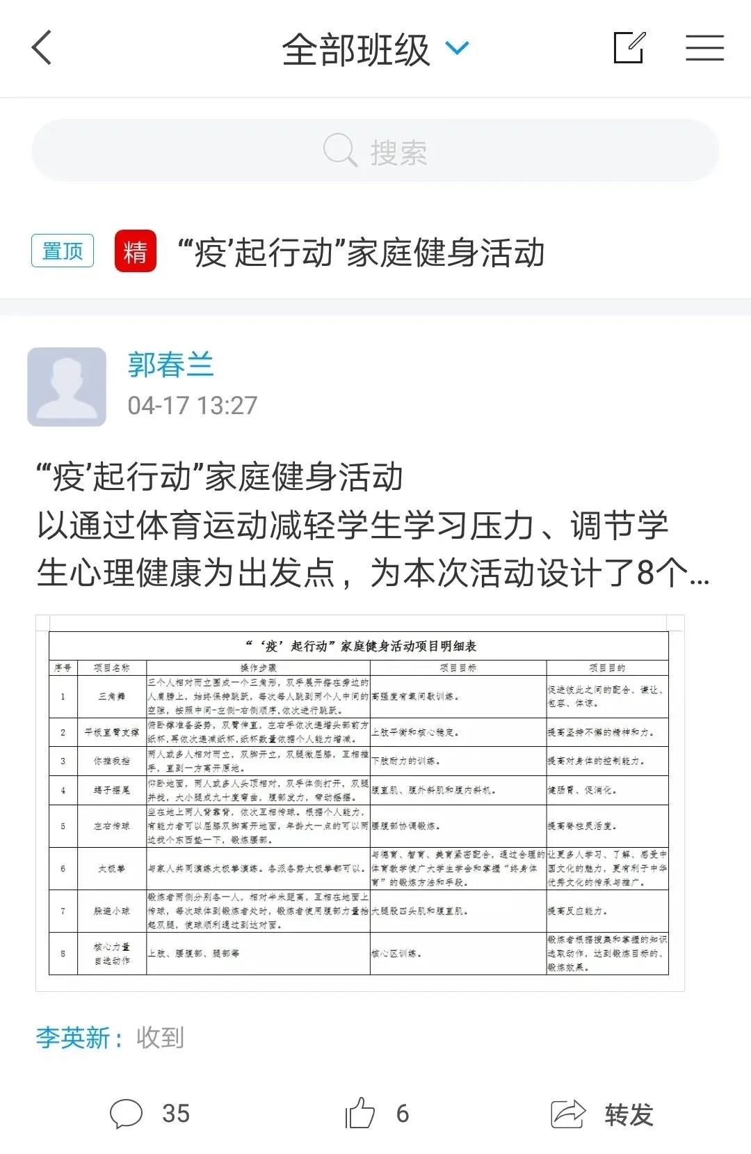 随着网络体育课程教学的不断深入,为提高学生在疫情防控期间参加体育锻炼的积极性,也同时带动家人及周围的朋友共同健身,增强自身抵抗力,体育教研室向全校学生发出"'疫'起行动"家庭健身活动倡议,希望全体学生能够积极开展家庭体育健身活动,用实际行动带动家人及朋友建立健康的家庭生活方式,为抗击疫情防控工作做贡献。活动以通过体育运动减轻学生学习压力、调节学生心理健康为出发点,设计了8个项目,全部以游戏的方式进行,针对不同的部位进行锻炼,过程轻松愉快,分别为"三角舞"、"平板直臂支撑"、"你推我挡"、"蝎子摆尾"、"左右传球"、"太极拳"、"躲避小球"、"核心力量自选动作"。让父母参与进来,可以拉近孩子与父母之间的关系,增进家长和孩子之间的情感交流。
