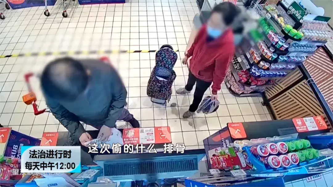2021年10月9日上午9点多,一对中年夫妇来到北京一超市的自助结账区,丈夫负责扫码结账,妻子负责装货。当扫到两袋排骨时,夫妇俩交流了一下,趁人不注意,丈夫只扫了一袋排骨,就急忙装进了自己的手拉车,快速离开了。
