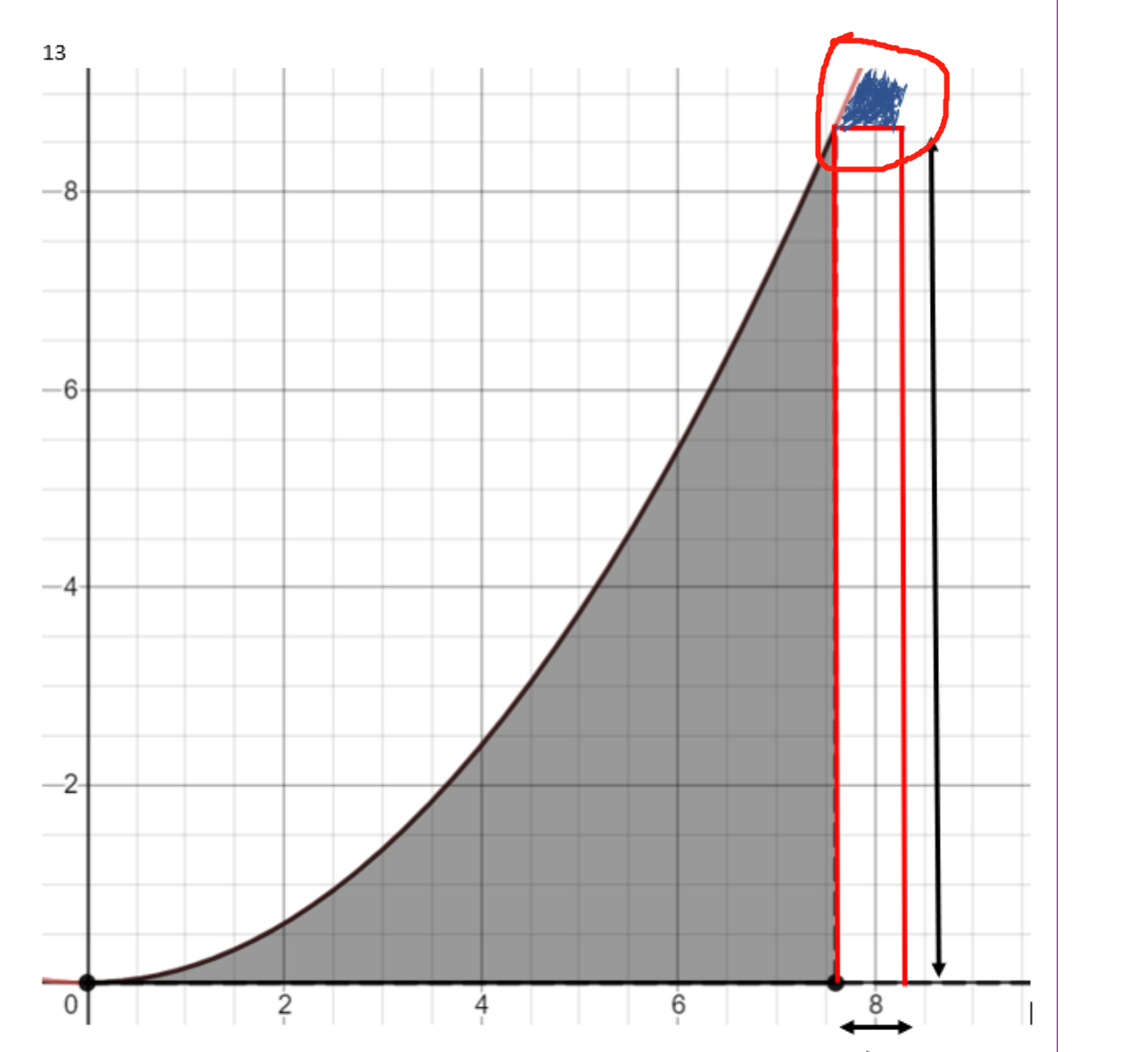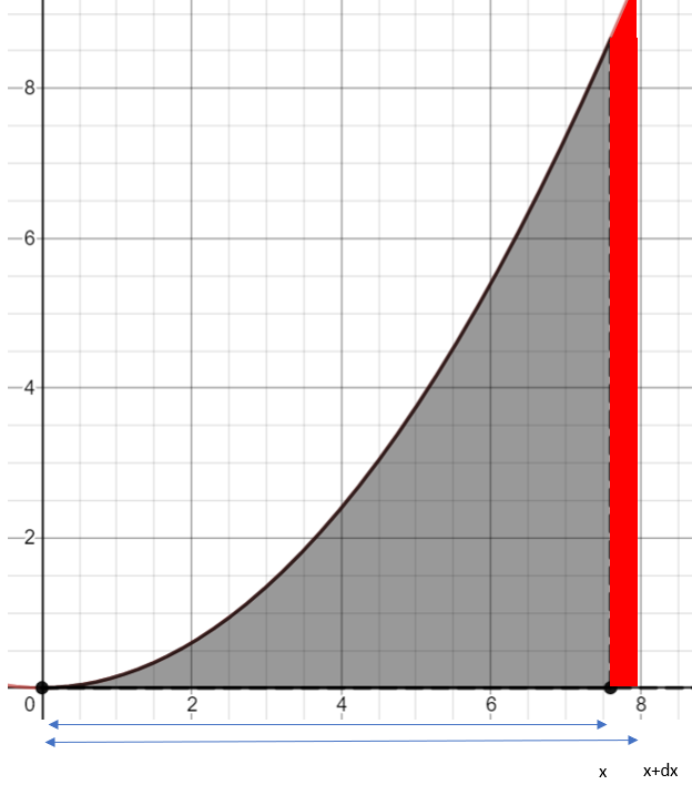 当我们使用近似F(x+dx)大约等于F(x) +dx * F(x),我们看到以下内容。dx*f(x)用红色矩形的面积表示,它的高是f(x),宽是dx。这是一个好的线性逼近吗?是的!重新写一下,x = 8处的近似函数是F(8) + h* F(8)。我们还可以看到,这个矩形包含了F(x+dx)得到的所有面积。下面可以看到,我们遗漏的区域只是蓝色阴影的小区域,它比矩形区域小得多。