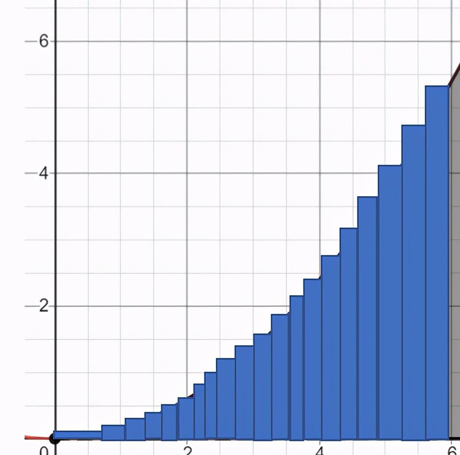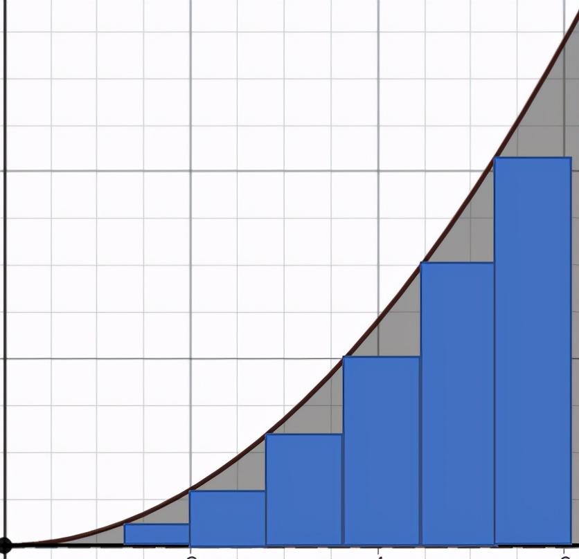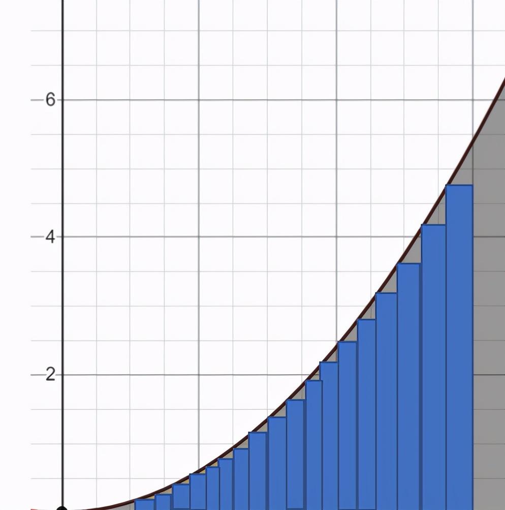 我们在图下面画一些矩形,然后把它们的面积加起来。由于矩形在每一点都低于图形,这提供了一个低估的面积。