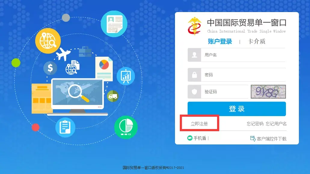 新注册企业,登录中国国际贸易单一窗口进行新用户注册,点击立即注册。