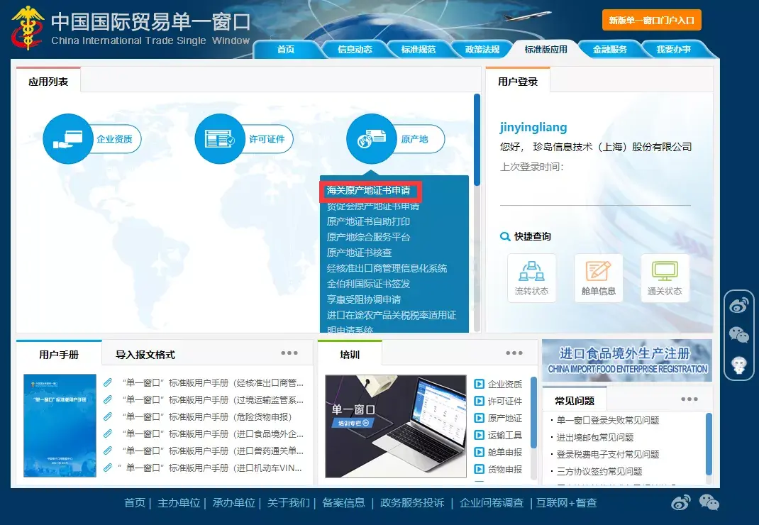 注册或登陆成功后,进入“标准版应用”版面中的“原产地”模块中的“原产地综合服务平台”,进行企业备案申请。