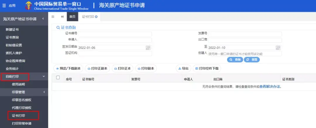 证书审核通过后,进入“自助打印”→“证书打印”,可查询待打印的原产地证书。