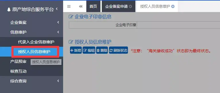 点击菜单中的“信息维护”→“授权人员信息维护”→“+新增”,填报授权人员信息:
