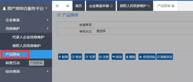 企业备案通过之后,可以添加产品信息,提交产品预审申请。点击菜单中的“产品预审”→“+新增”,显示如下图: