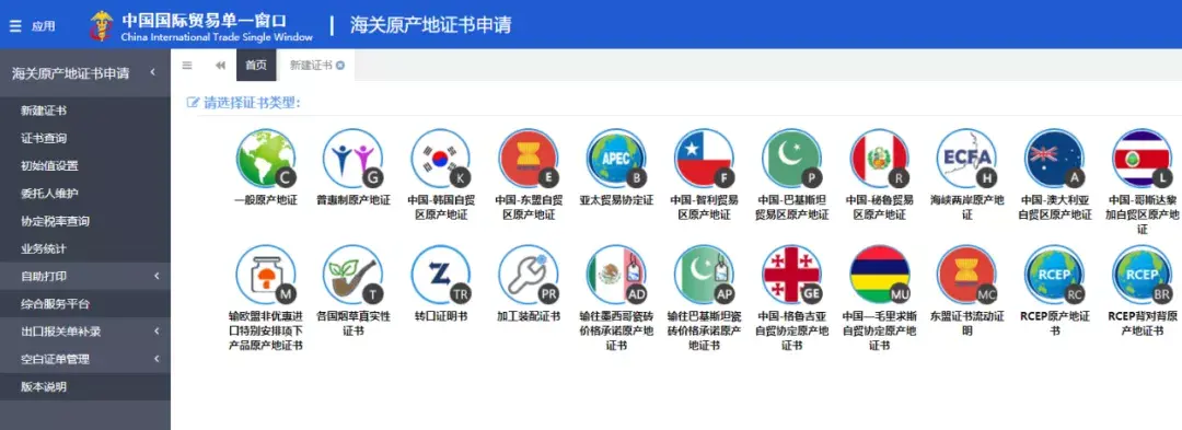 企业备案完成后,可以办理原产地证书申请,申请人应在货物出口前或出口时向海关申请办理原产地证书。可登录中国国际贸易单一窗口网站(http://www.singlewindow.cn),选择“海关原产地证申请”→“新建证书”,进行网上申报。