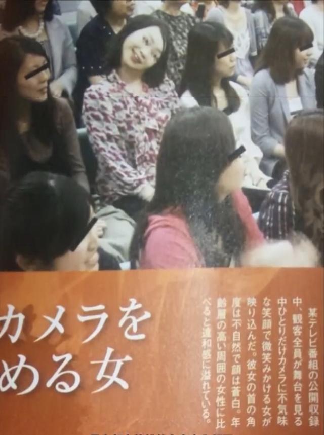 从文章中能了解到,它的出现是在日本的一个综艺节目录制中,当所有的嘉宾和观众皆把视线放在舞台的时候,唯有图片上那位面色异常苍白,头颅倾斜弧度诡异的女生是在看向拍摄镜头,显得非常古怪和明显,让图片的观看者们一眼就看出来她的违和感。