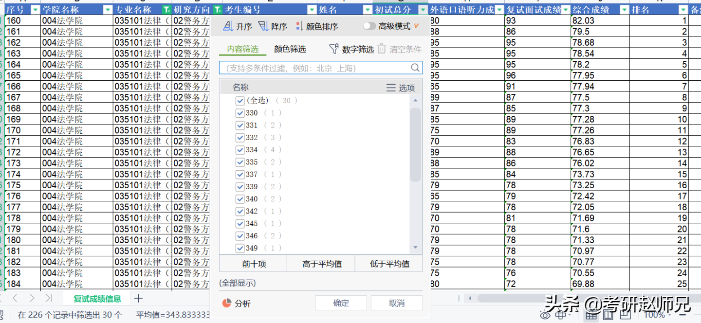 警务方向的最低分330分,平均分343分。