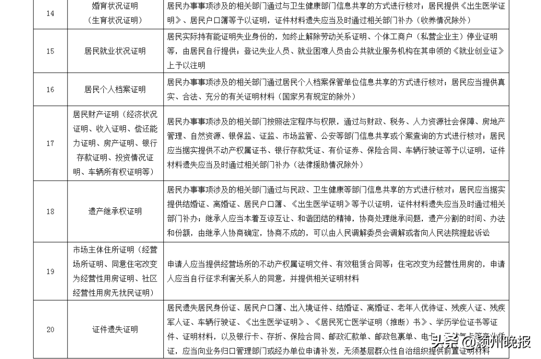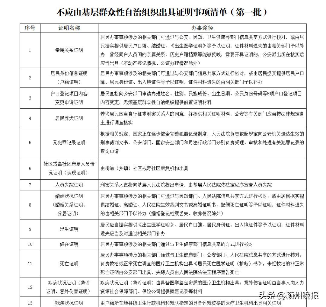 另外,意见还列出首批20项不应由基层群众性自治组织出具证明事项清单,包括亲属关系证明、居民身份信息证明、户口登记项目内容变更申请证明、居民养犬证明、无犯罪记录证明、社区戒毒社区康复人员情况证明(表现证明)、人员失踪证明、婚姻状况证明、出生证明、健在证明、死亡证明、疾病状况证明 、残疾状况证明、婚育状况证明、居民就业状况证明、居民个人档案证明、居民财产证明、遗产继承权证明、市场主体住所证明、证件遗失证明。