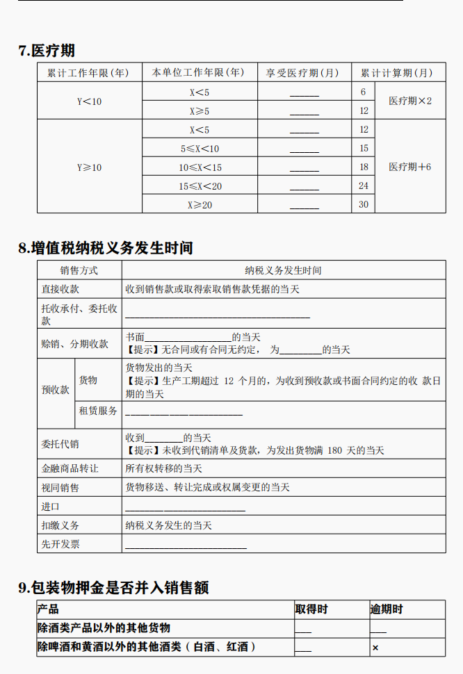 经济法基础的最后6页纸是以填空的形式来汇总的,大家在最后几天备考的时候,只背空白的知识点!填空的部分和答案是分开和大家整理,背会了,大家可以再默写一下,看看掌握的情况如何!