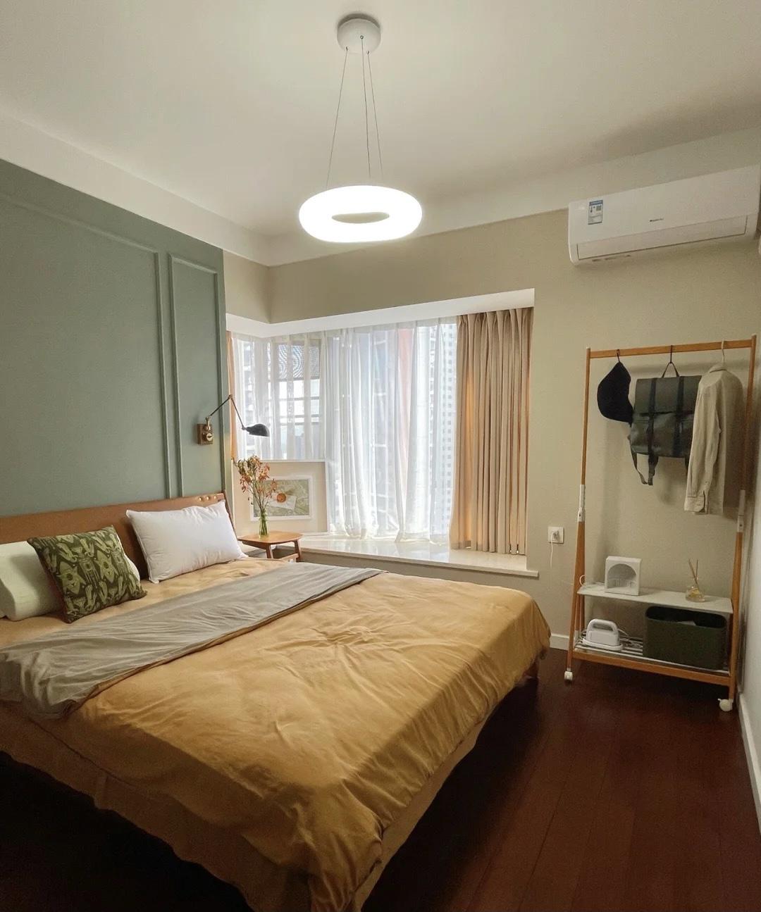 主卧的背景墙采用深灰绿色设计,视觉上让人感到轻松。其他墙面都是浅米色,温度也比较适中。
