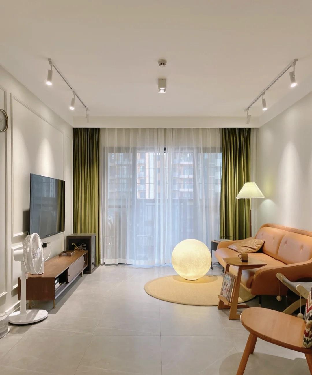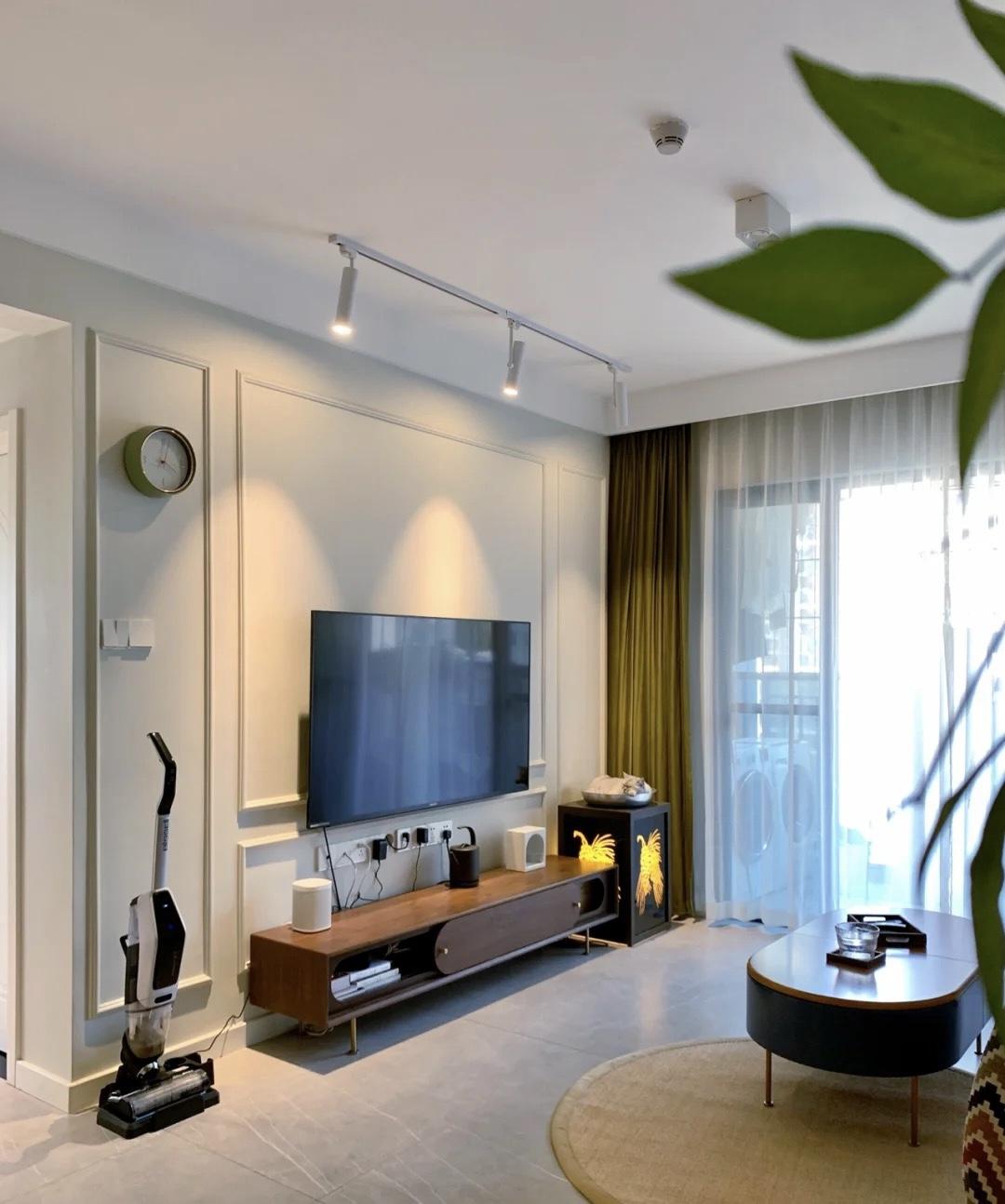 客厅以中性灰和绿色为主,很简单。搭配木质家具,温柔简约,有温度感。有三个轨道射灯,没有主灯,空间更高大,灯距可以随时调整,光源充足。