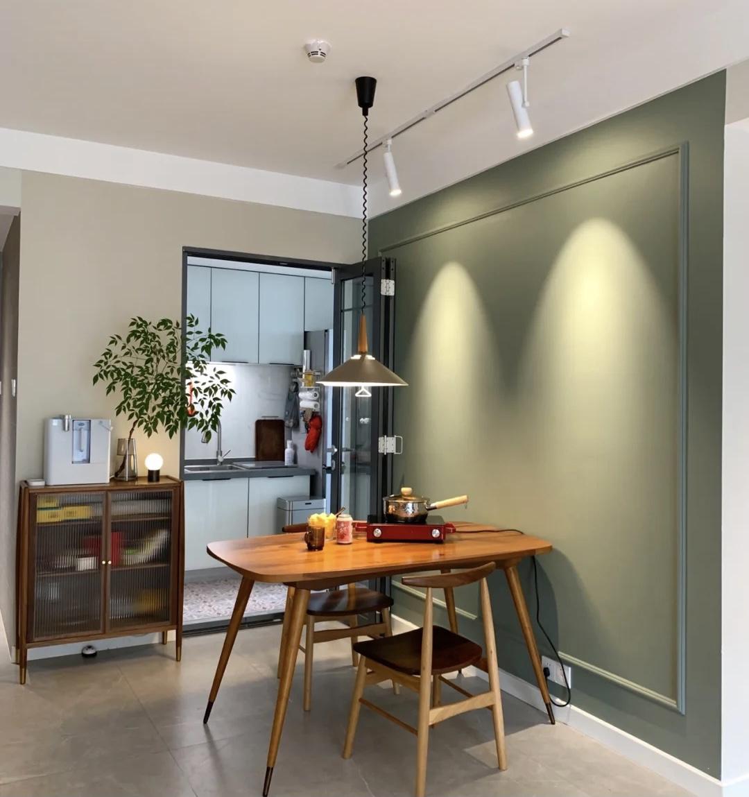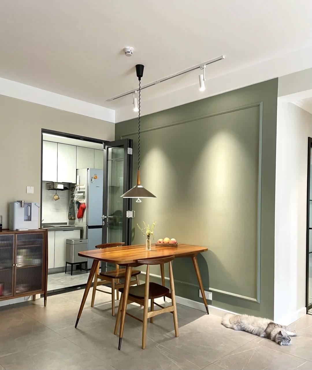 餐厅用橄榄绿乳胶漆粉刷,用墙漆视觉分隔,墙上设计了一圈石膏线条,简洁又增添了层次感。餐厅设计有两套照明。餐厅吊灯作为主灯,可以随意调节高度来控制照明范围。同时光线柔和温暖,让人胃口大开。轨道聚光灯用作辅助照明。