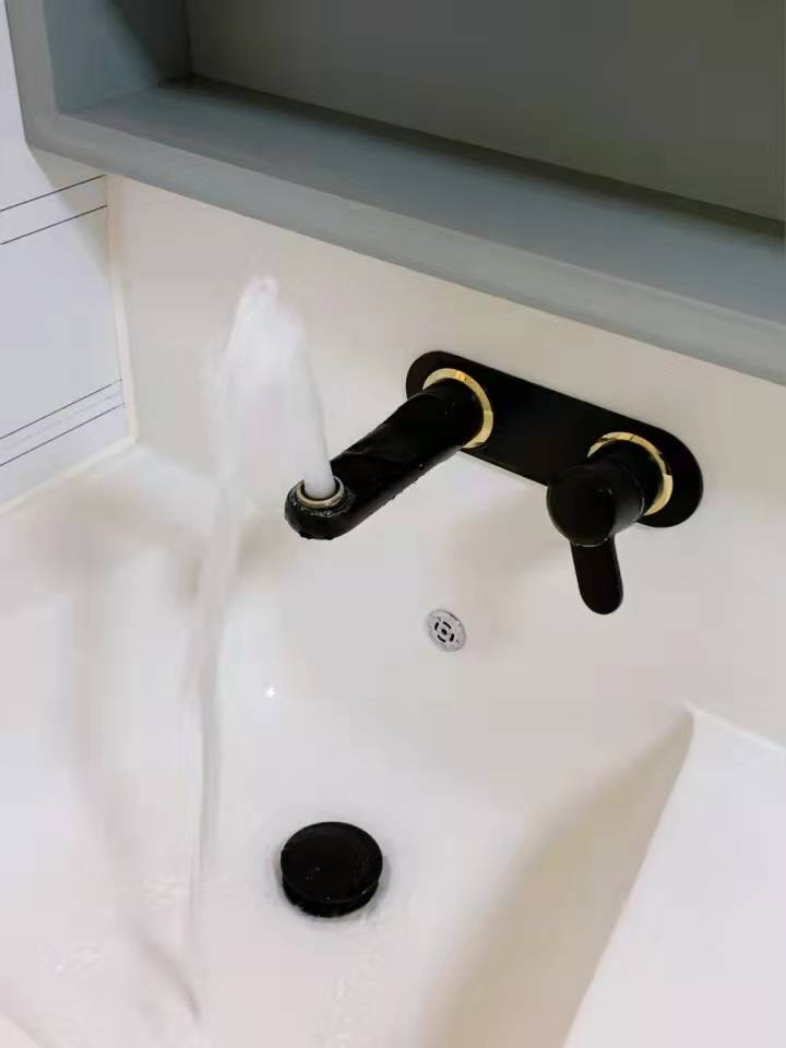有两个最喜欢放浴室柜的地方。一个是壁挂式出水水龙头的设计。一般来说,墙式出水龙头在做水电的时候都要提前准备好。这个浴室柜不需要特别准备,可以正常安装。